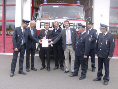 Übergabe von Fördermitteln für die Stützpunktfeuerwehr Bleicherode Am Freitag, dem 2. Oktober 2009, stattete der Chef der Staatskanzlei Thüringens, Dr. Klaus Zeh, der Stadt Bleicherode einen lang ersehnten Besuch ab. Er hatte einen Fördermittelbescheid des Landes Thüringen im Gepäck.Das Feuerwehrgerätehaus in der Gütersloher Straße war der richtige Rahmen für die Übergabe des Bescheides an Bürgermeister Frank Rostek. Auch der 1. Beigeordnete, Dr. Uwe Landsiedel und Ordnungsamtsleiter Burkhard Keil waren zugegen, als der Minister den Bescheid über 125.000 € aushändigte. Die Summe ist für die notwendige Beschaffung eines Hilfeleistungs-Löschgruppenfahrzeuges HLF 20/16 vorgesehen. Die Bleicheröder Feuerwehr mit ihrem großen Verantwortungsbereich kann auch bei Unfällen auf der Autobahn BAB 38 vom Höllbergtunnel im Eichsfeld bis nach Werther zum Einsatz kommen und benötigt dafür die entsprechende moderne Technik.Bürgermeister Rostek bedankte sich im Namen der Stadt und der Feuerwehr für die Unterstützung des Ministers. Auch Stadt Bleicherode ist ständig bemüht, ihre Feuerwehr im Rahmen ihrer Möglichkeiten zu unterstützen. So ist z. B. die verstärkte Nachwuchsförderung nicht nur eine wichtige Aufgabe der Feuerwehr selbst, sondern auch ein Anliegen des Bleicheröder Stadtoberhauptes. Deshalb erhalten seit dem Jahr 2009 die jüngsten Mitglieder der Wehr Saisonkarten für das Bleicheröder Freibad. Durch die Herabsetzung des Eintrittsalters von Kindern in die Jugendfeuerwehr auf 6 Jahre hat das Interesse der kleinen Bleicheröder für die Feuerwehr stark zugenommen.