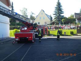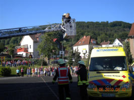 Große Aufregung in der Staatlichen Grundschule "August Petermann" in Bleicherode.Am vergangenen Freitag wurde durch die automatische Brandmeldeanlage Feueralarm ausgelöst. In kürzester Zeit verließen die Schüler und Lehrer das Gebäude.Im Lehrerzimmer war ein Brand ausgebrochen; die Schulleiterin stellte nach Abschluss der Evakuierung fest, dass sich noch eine Praktikantin im Gebäude befinden muss.Die alarmierte Feuerwehr Bleicherode war rechtzeitig vor Ort, um die Praktikantin aus dem brennenden Gebäude zu retten und das Feuer zu löschen.Dabei gingen die Feuerwehrangehörigen unter schwerem Atemschutz und über die Drehleiter vor.Auch der Rettungsdienst und Kräfte der Polizeiinspektion Nordhausen kamen zum Einsatz.Zum Glück war es "nur" eine Einsatzübung, in der das Zusammenspiel von Rettungskräften und dem Personal der Grundschule geübt werden sollte.
