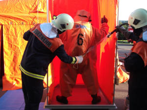 Gemeinsame GefahrgutausbildungBesonderes Augenmerk widmet die Freiwillige Feuerwehr Bleicherode der Gefahrgutaus-bildung ihrer Angehörigen.Im Rahmen einer ganzen Serie von Ausbildungsveranstaltungen zu diesem Thema, die sich über die Monate Juli und August erstreckt, wurde am vergangenem Freitag die Dekontami-nation von Personen geübt.Als Gäste am Gerätehaus konnten Kameradinnen und Kameraden der Freiwilligen Feuer-wehr Niedersachswerfen begrüßt werden, die im Gefahrgutzug des Landkreises Nordhausen für diese Aufgabe zuständig ist.Auch Angehörige der Freiwilligen Feuerwehren Obergebra, Sollstedt und Niedergebra nahmen an der Ausbildung teil.