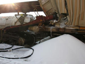 ein weiteres Problem. Am zweiten Zug ist ein riesiger Container von seiner Plattform gerutscht und auf ein