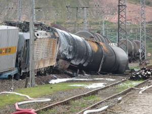 brannten Kesselwagen voller Benzin. Ein Lokführer wurde leicht verletzt. 50 Anwohner wurden evakuiert. Strecke